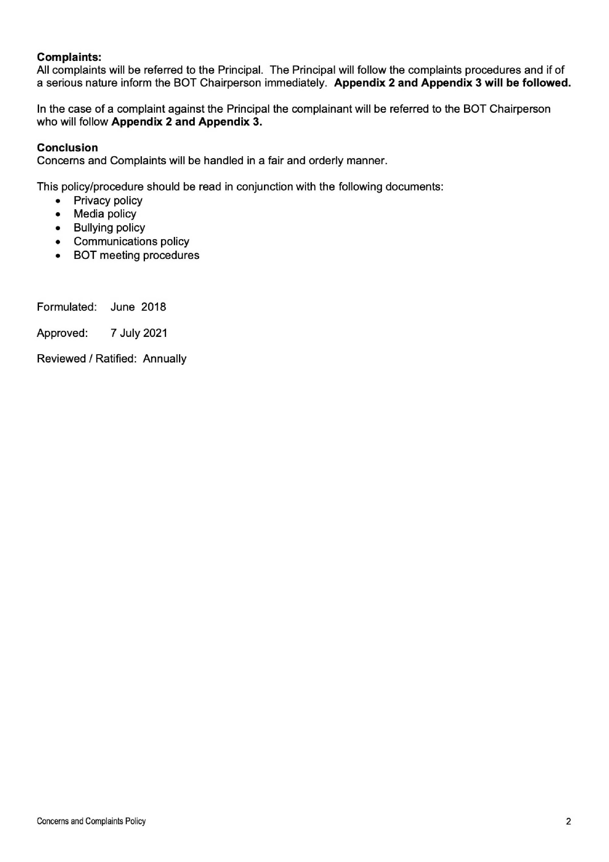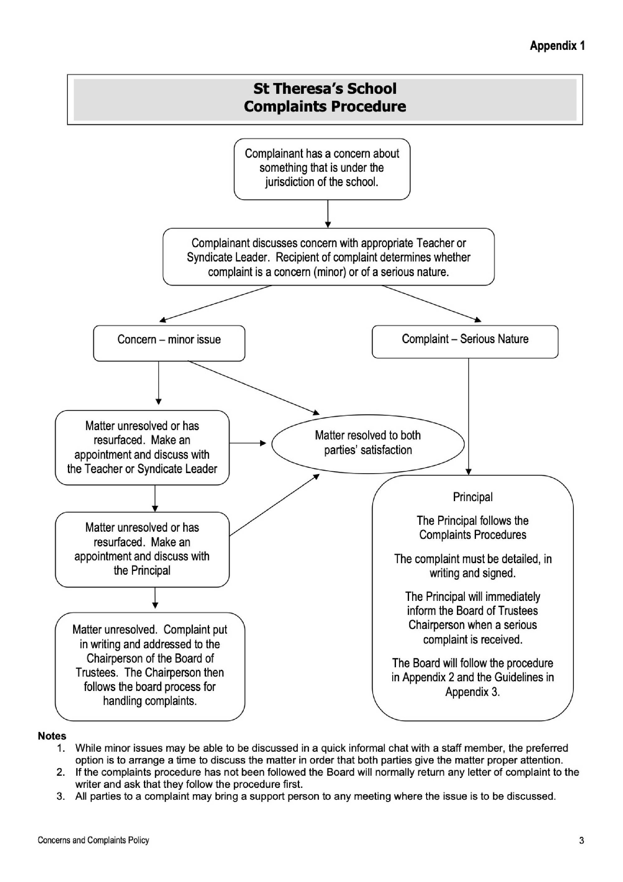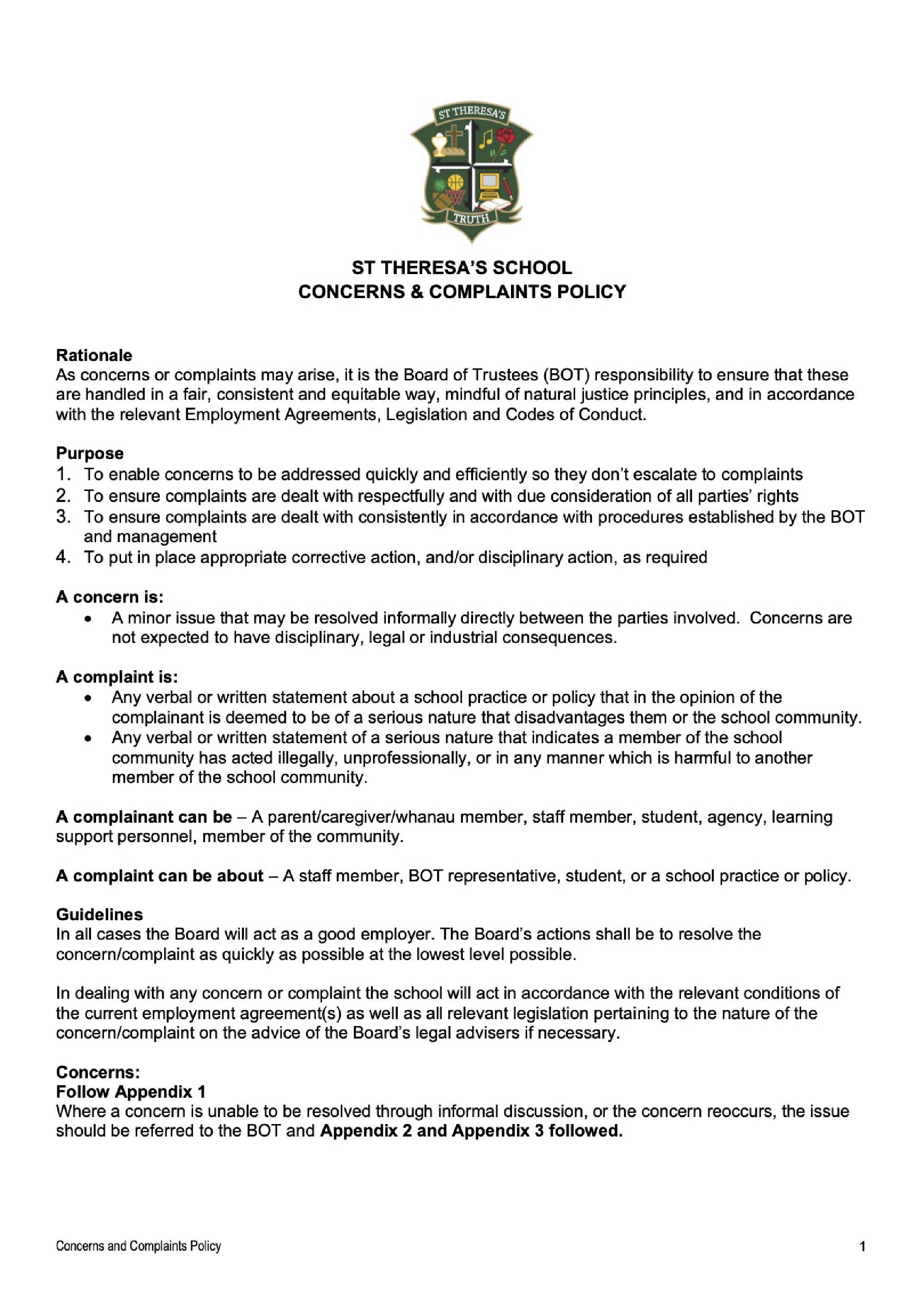 St Theresa’s School philosophy encourages active participation and dialogue between parents, student’s teachers and Principal for their mutual benefit. While it would be ideal for all dialogue to be positive, from time to time concerns and complaints regarding the operation of the school at all levels will arise. There needs to be guidelines and procedures in place so that these concerns can be voiced and acted upon at the appropriate level in a constructive and objective manner.